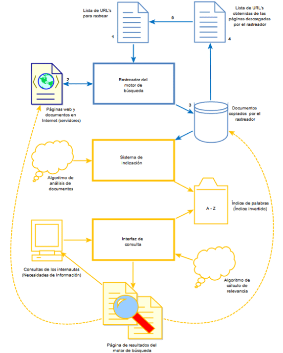 Una forma de entender las funciones de un motor de búsqueda consiste en concebirlo como una clase de sistema de información documental (motor de búsqueda) que acepta dos clases de entradas: documentos (las páginas webs principalmente) y necesidades de información (preguntas de los internautas). La salida del sistema (personas informadas) es una lista de sitios web que contienen información capaz de satisfacer las necesidades de información del usuario, quien examina la relevancia de los resultados y si no le satisfacen, reitera la pregunta usando otros términos o introduciendo algún otro tipo de cambios.